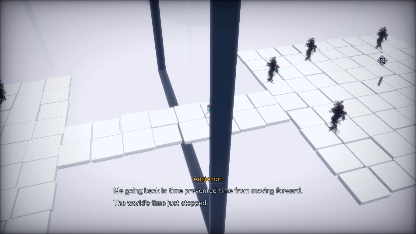 The player character is initially introduced simply as an agent of the organization Adamas, but we learn throughout the story that they are neither human nor digimon, although taking the form of the former, and ultimately doing the bidding of Homeostasis (who is usually just referred to as ‘a higher being’ in the narrative); a role very similar to Adventure’s Gennai.
