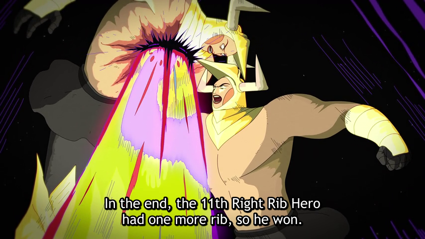 So he tries a hero’s rib, thinking that at least he’d get to feel heroines hugging him. Unfortunately, when the hero rejects the heroine, he confesses, freaking everyone out. The hero tries to rip him out, except he got the wrong rib, and the rejected rib turns into a hero of his own, battles, and wins… so the other ribs do likewise in a destructive 24-way battle royale.
